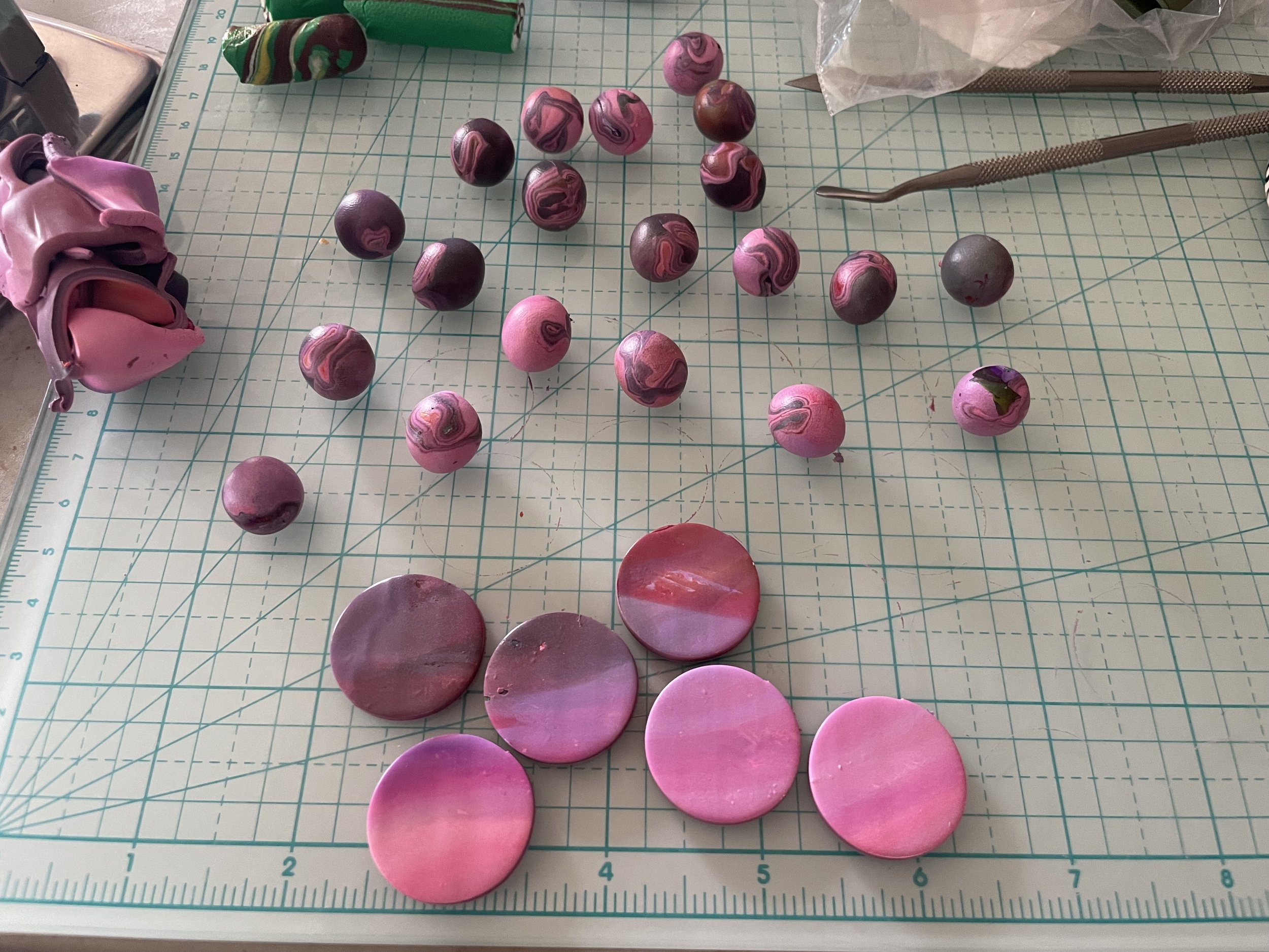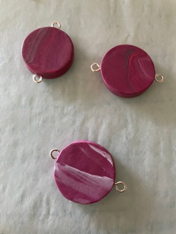 Here I took leftover pink and brown clay and made some beads. I made round ones and flat ones. I used a small round cutter so all the beads are from the same amount of clay and rolled into the same size.