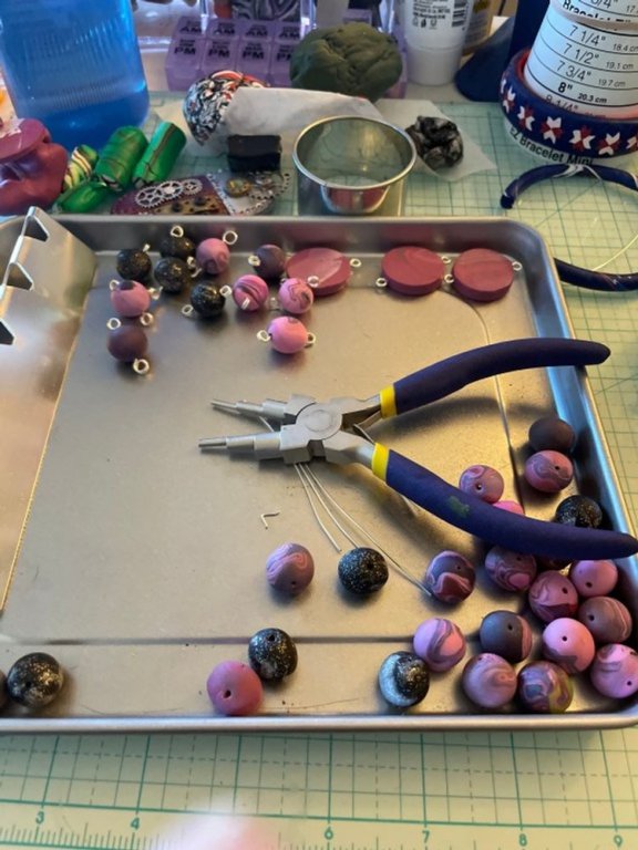 Here you see the flat ones after they came out of the oven along with some round ones. I started gluing in the eye pins to the round beads. This will help me link everything together.