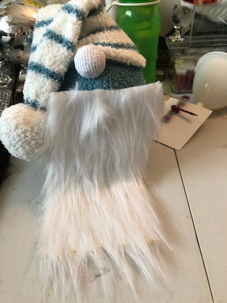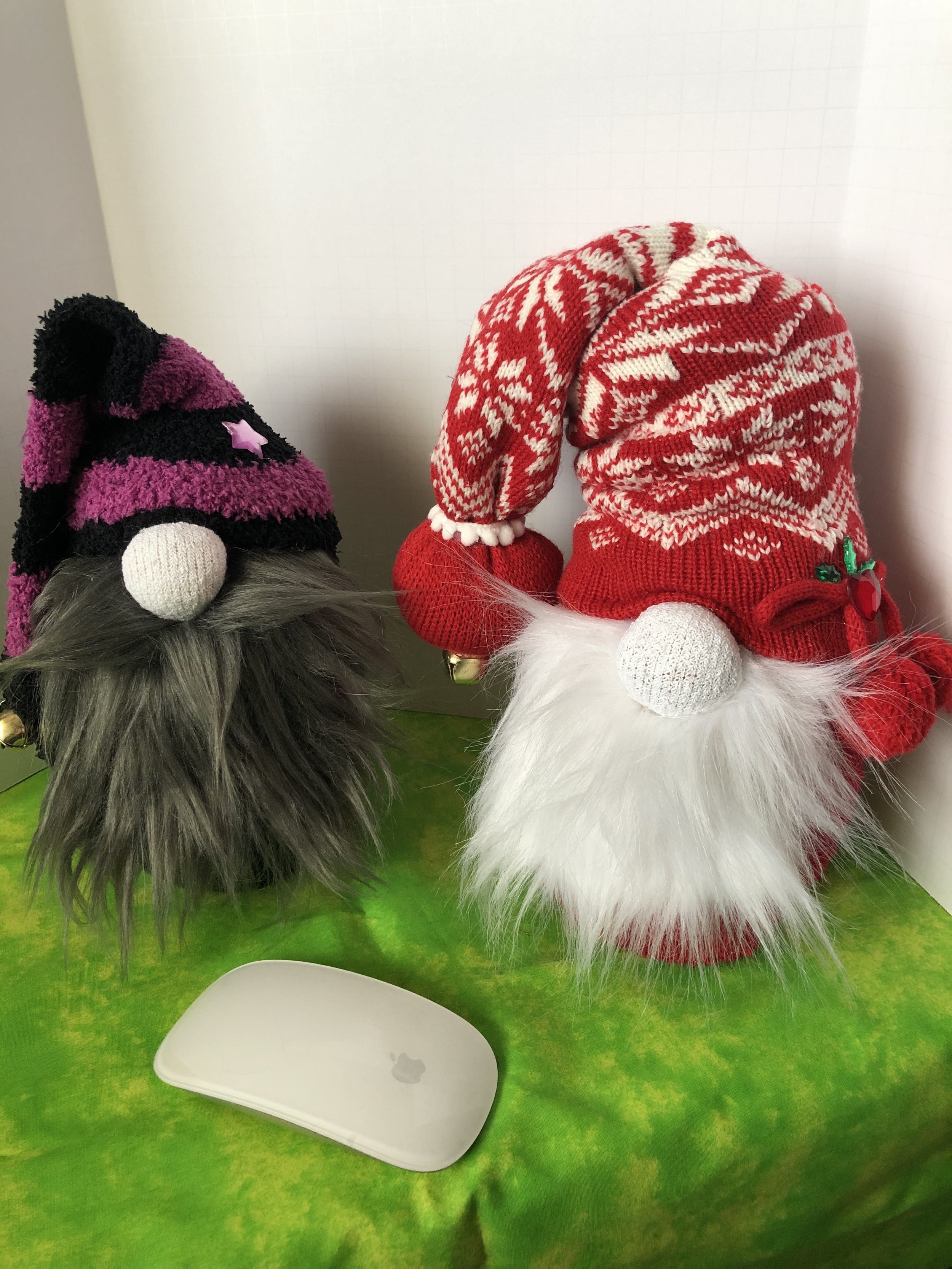 These lil guys are made from 2 pairs of Dollar Store socks, (one for the body, one for the hat) rice, and some fake fur I got from a small rug, glue, elastic, blush makeup, scissors etc.