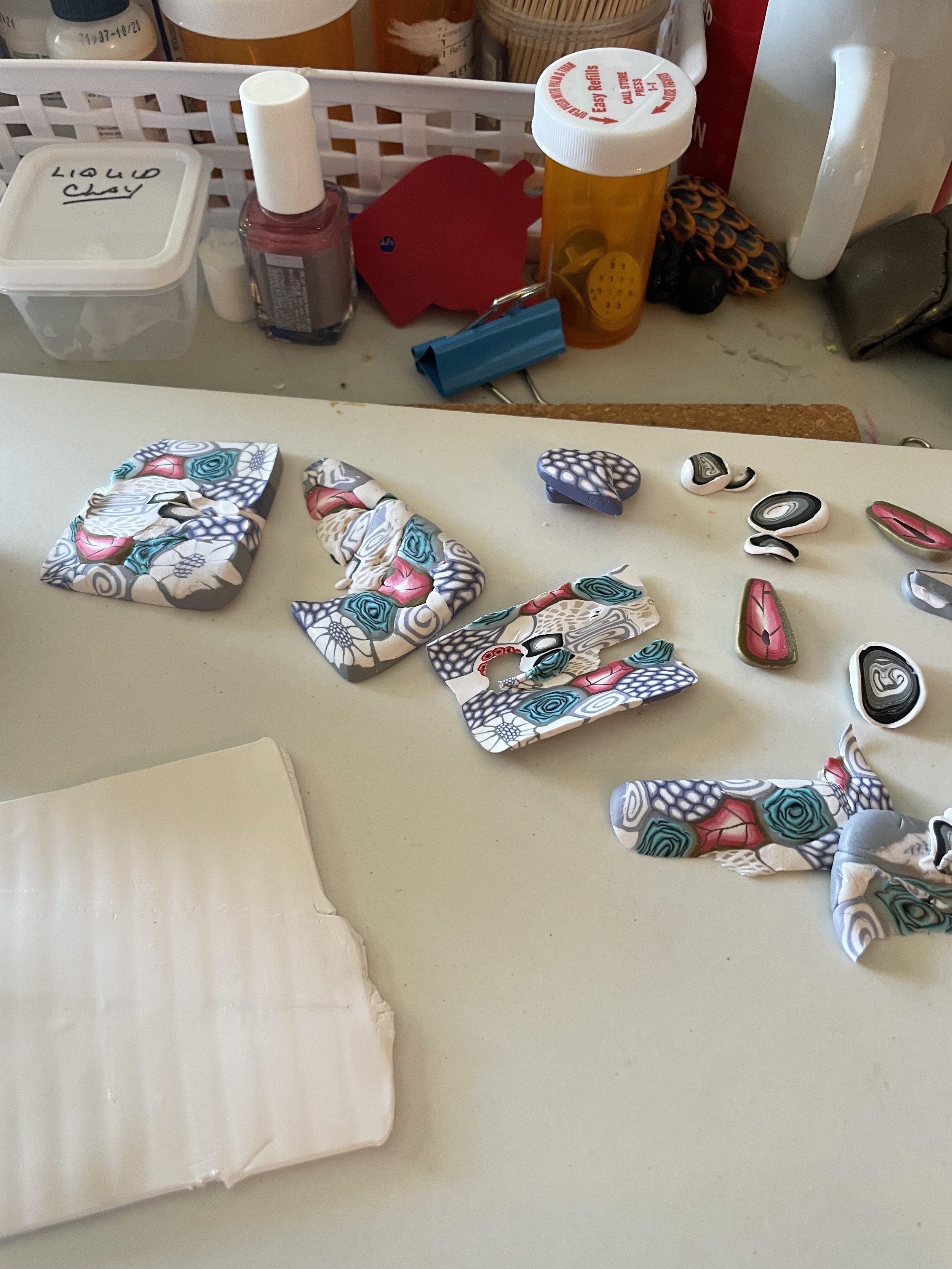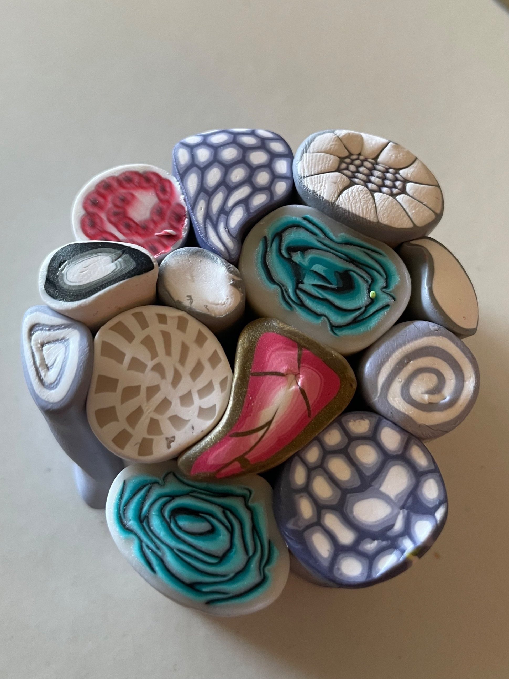 The selection of polymer clay canes, meticulously reduced to reveal intricate patterns, holds the potential to transform the otherwise plain white slab into a mesmerizing piece of wearable art. Piece by piece, I deftly arrange the slices, considering colour, size, and pattern to create a captivating composition.