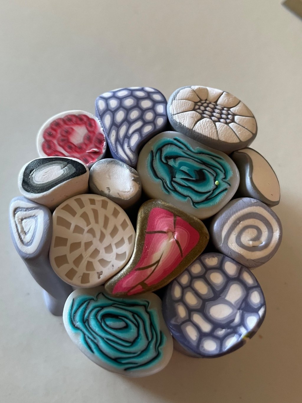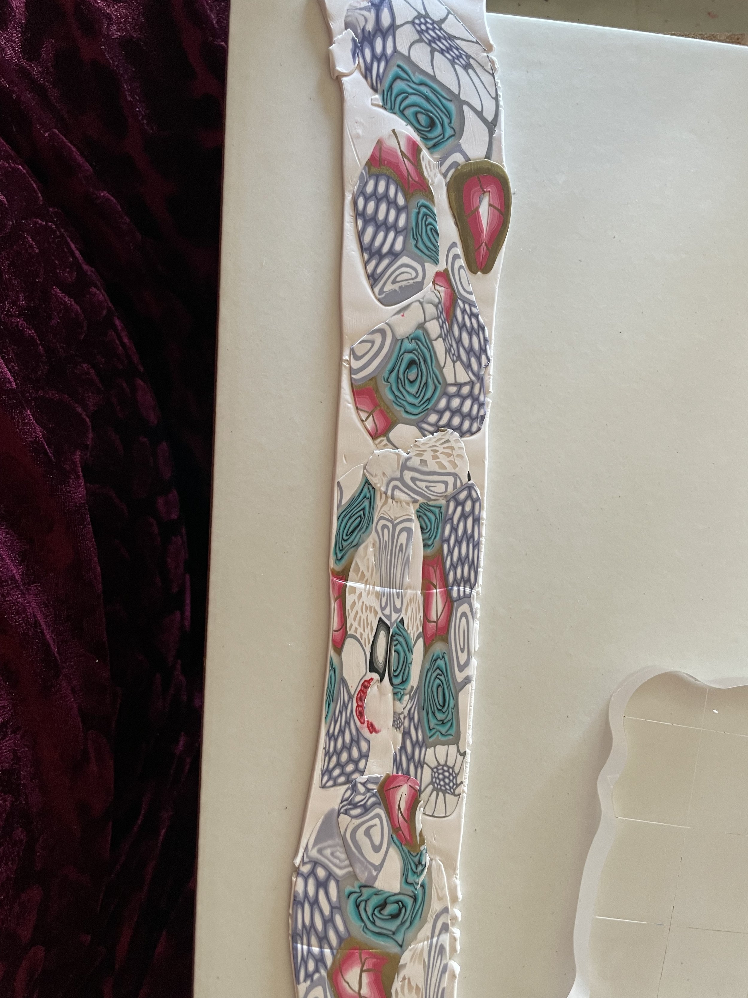 As polymer clay artist I worked diligently on this latest project, my creative focus was centred on refining the design of a bangle bracelet. With a thin white slab as the canvas, I delicately placed and arranged slices of reduced polymer clay canes onto its surface.